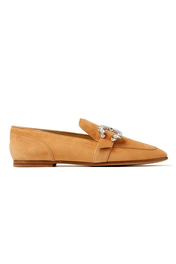 Mocassins en daim caramel avec boucle sertie de cristaux de Jimmy Choo