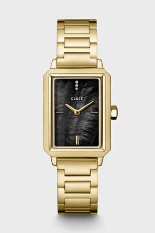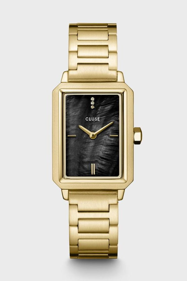 Montre carrée, dorée et cadran noir de Cluse x Iris Mittenaere