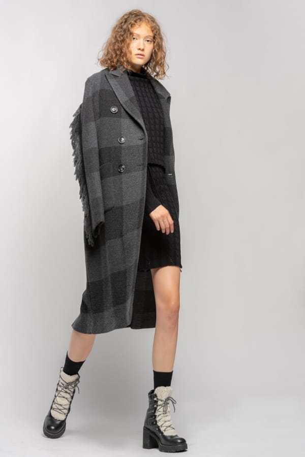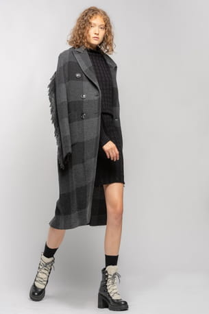 Manteau gris à carreaux et à franges mi-long de Pinko