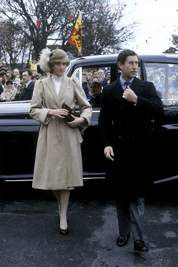 Lady Diana en manteau ceinturé camel au Pays de Galles en 1981