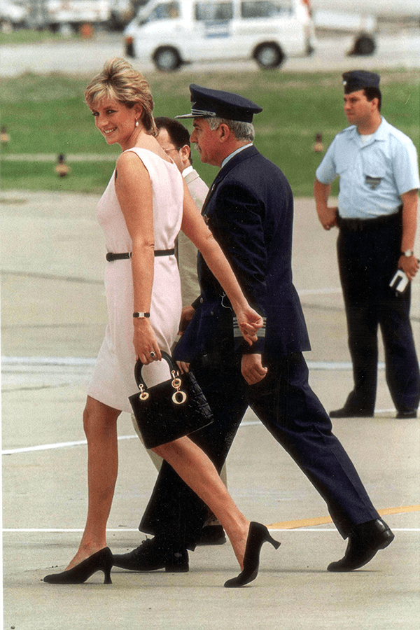 Lady Diana en robe blanche et sac à main Lady Dior en Argentine en 1995 © Mike Forster/Daily Mail/REX/Shutterstock/Sipa