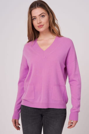 Pull en cachemire magnolia à col en V et poches de Repeat Cashmere