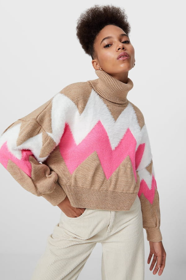 Pull à frise fluo marron, rose et blanc à col roulé de Stradivarius