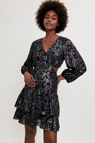 Robe noire et argentée ajourée en jacquard lamé à volants de Maje