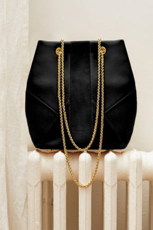 Bourse noire à chaîne dorée en cuirs et velours  "Les yeux d'Elsa" de Pö&me