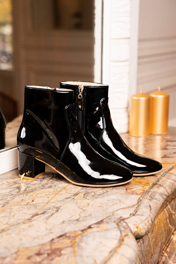 Bottines vernies noires en matière vegan upcyclée "Tilleul" de Minuit sur Terre