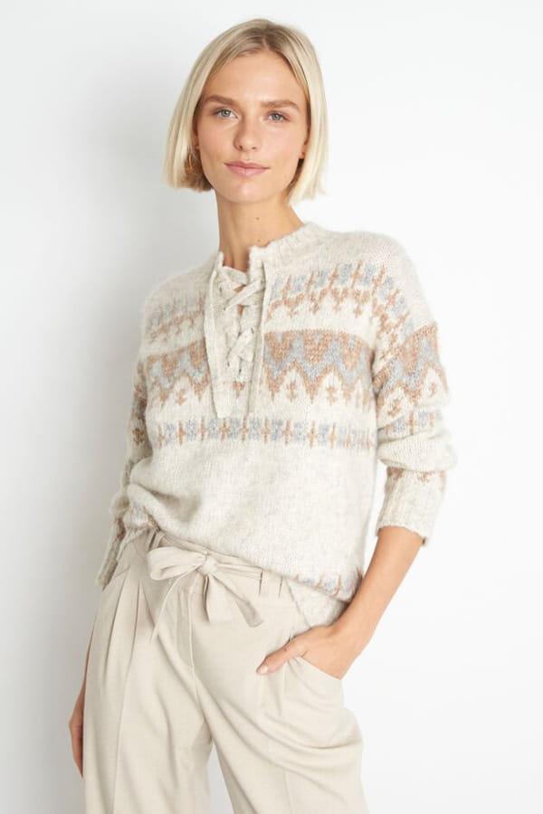 Pull beige à col lacé et motifs hivernaux de Maison 123