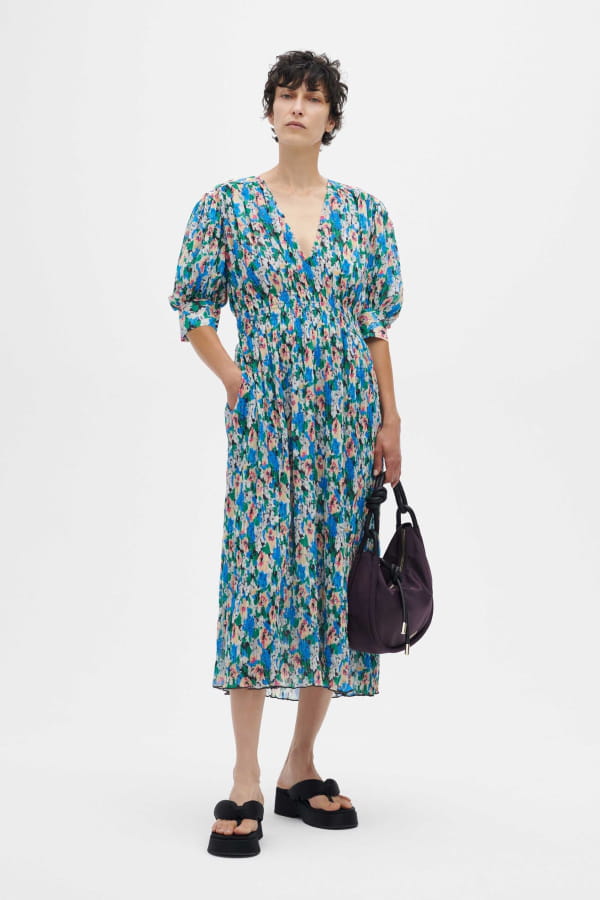 Robe bleue fleurie midi à manches ballons et à col en V de Ganni