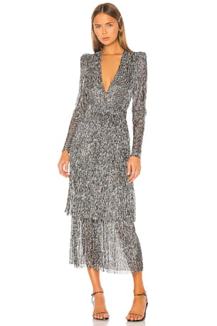 Robe mi-longue argentée ceinturée à épaulettes et col en V "Carry" de Sabina Musayev