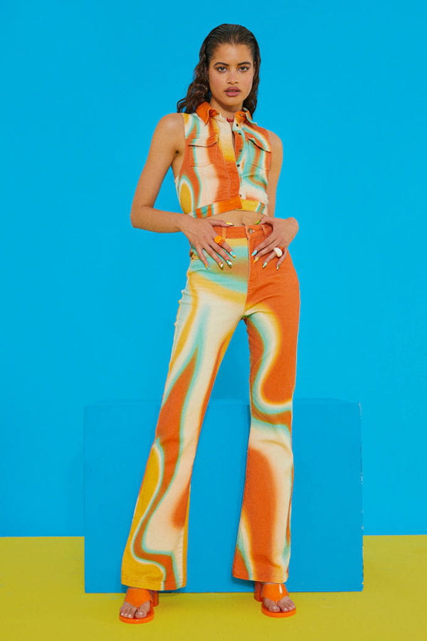 Jean bootcut taille haute coloré style hippie de Jaded London