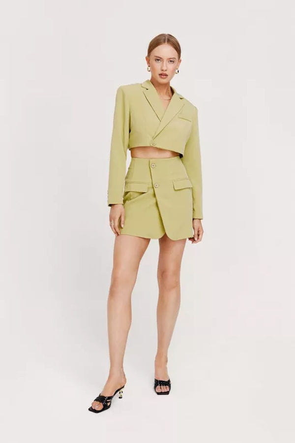 • Prix : 99 euros le blazer et 60 euros la minijupe portefeuille