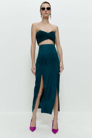 • Prix : 150 euros le top drapé et 160,50 euros la jupe fendue