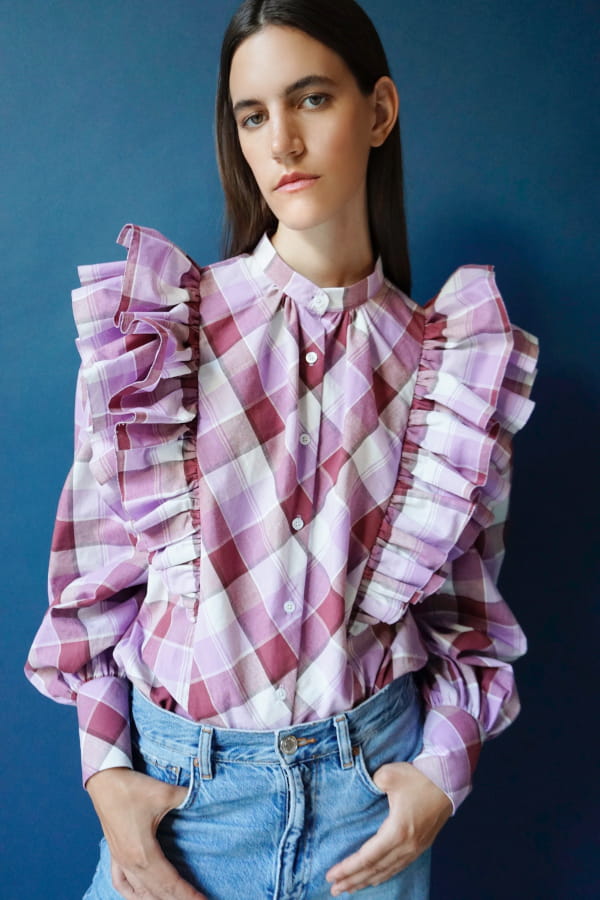 Chemise mauve à carreaux et manches bouffantes "Iris" de The Label Edition