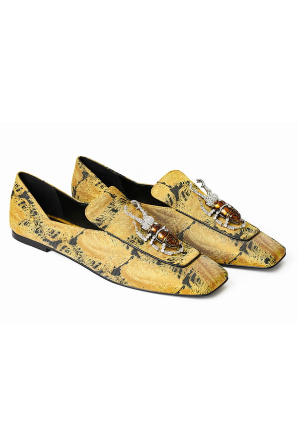 Mocassins jaunes et noirs brodés avec bijoux scarabée © H&M