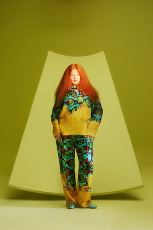 Veste et pantalon bleu et jaune à motifs exotiques de la collection Iris Apfel x H&M
