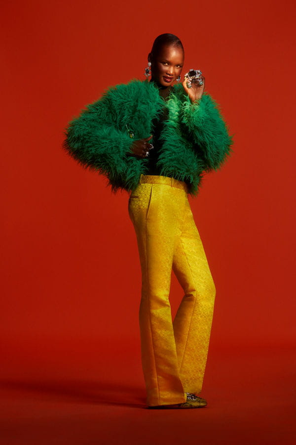Veste verte à plumes et pantalon jaune évasé de la collection Iris Apfel x H&M