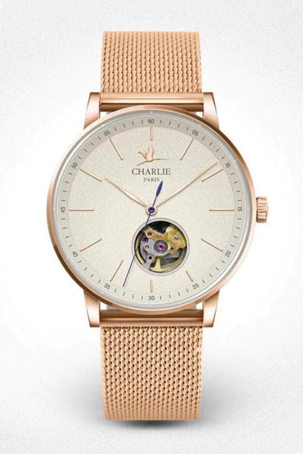 Montre rose et dorée automatique avec rouages apparents "Initial 36 - Cœur Ouvert" de Charlie Paris