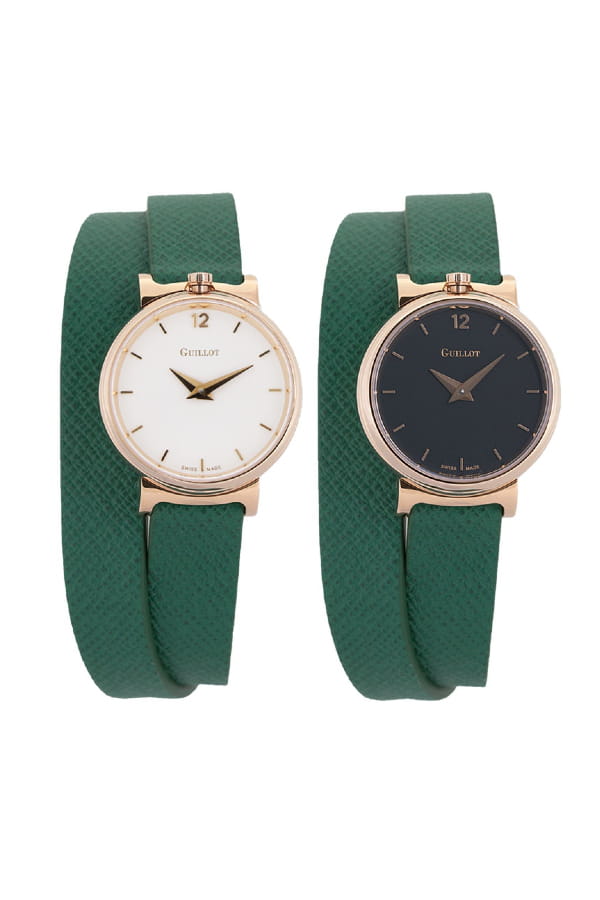Montres vertes aux cadrans blanc et noir du coffret "Lady" de Guillot
