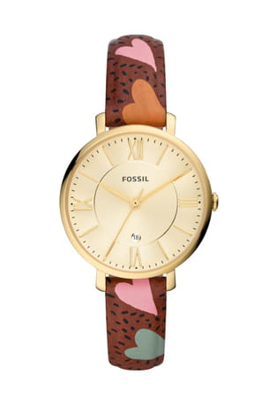 Montre à bracelet imprimé cœurs et à cadran doré de Fossil