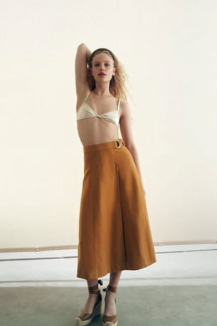 Jupe portefeuille mi-longue dans un tissu en mélange de lin de Zara