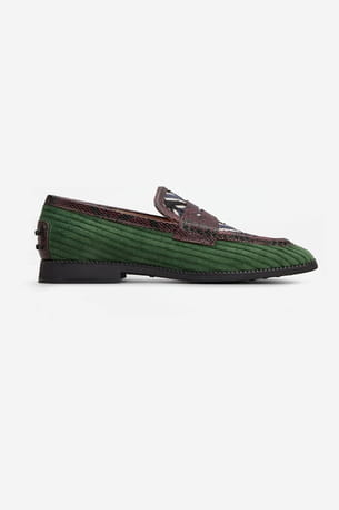 Mocassins en velours et cuir imprimé reptile vert bordeaux