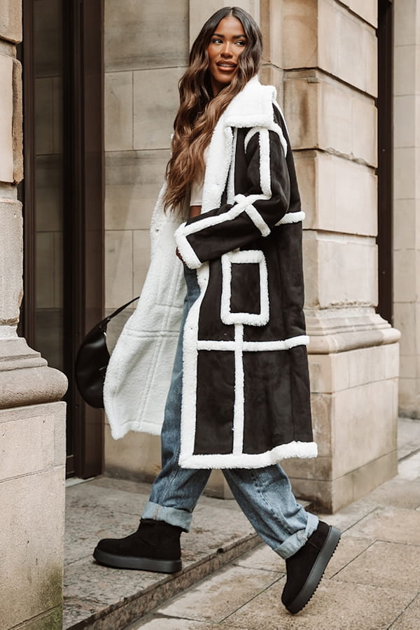 Manteau en suédine noire à carrés contrastants de PrettyLittleThing