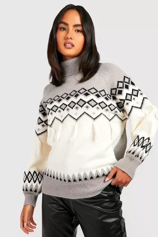 Pull de Noël à col roulé et franges gris et blanc de Boohoo