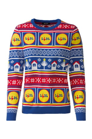 Pull de Noël bleu, rouge et jaune à logo de Lidl