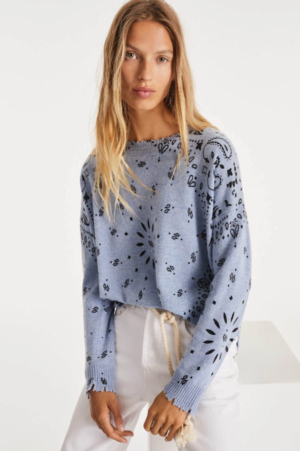 Pull bleu à col rond imprimé bandana "Mela" de Kujten