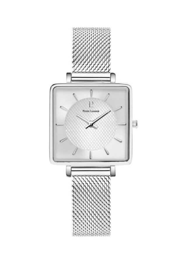 Montre argentée carrée à maille milanaise de Pierre Lannier