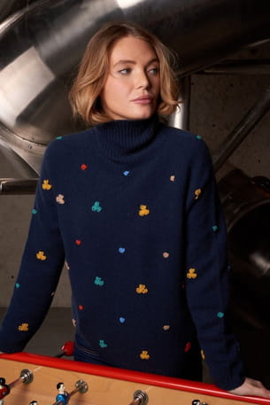 Pull en cachemire col roulé bleu à broderies multicolores d'Estheme Cachemire