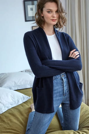 Cardigan bleu nuit en cachemire à col châle et à poches de Cyrillus