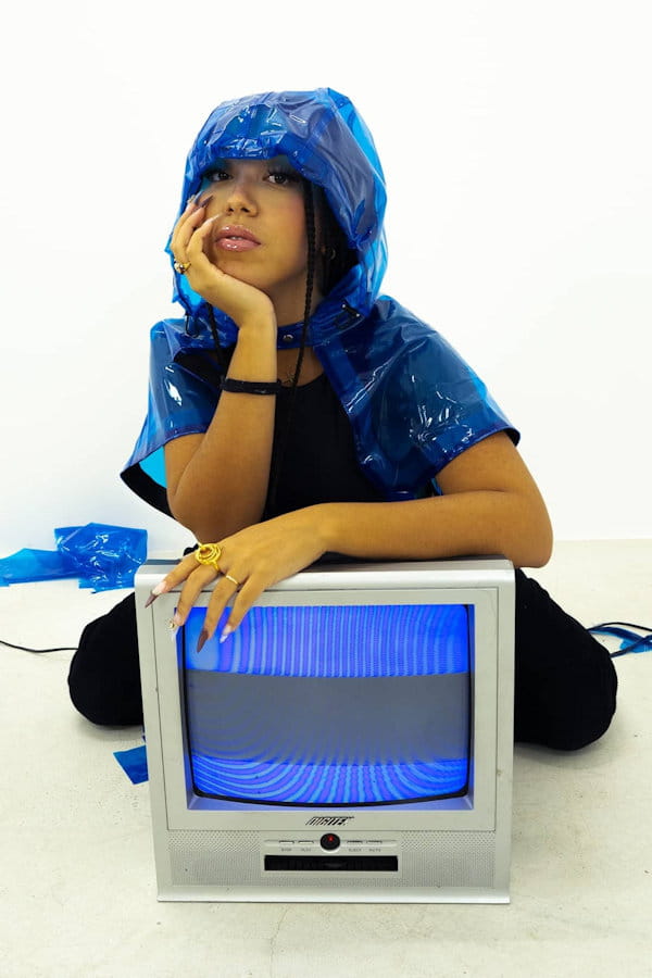 Capuche upcyclée de pluie avec épaulettes bleue d'Andrea Crews x Femme d'Intérieur chez Reiner Upcycling