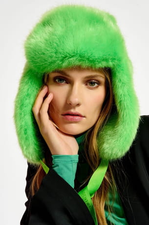Chapeau en fausse fourrure forme chapka vert fluo d'Essentiel Antwerp