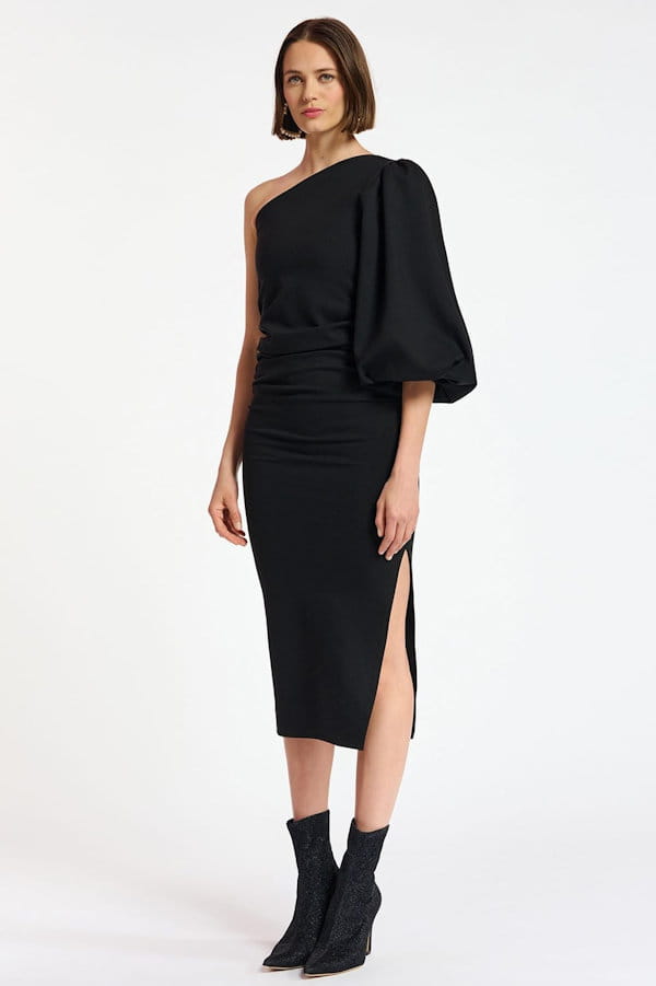 Robe noire midi en jersey asymétrique d’Essentiel Antwerp