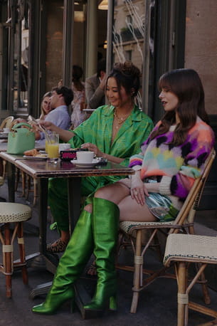 Emily avec un pull multicolore Essentiel Antwerp et Mindy avec un sac à main vert Louis Vuitton © COURTESY OF NETFLIX