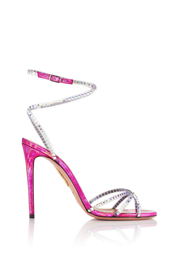 Sandales à talons fuchsia à strass d'Aquazurra chez La Samaritaine