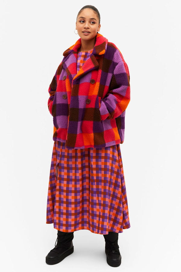 Manteau en fausse polaire à carreaux violet et orange de Monki