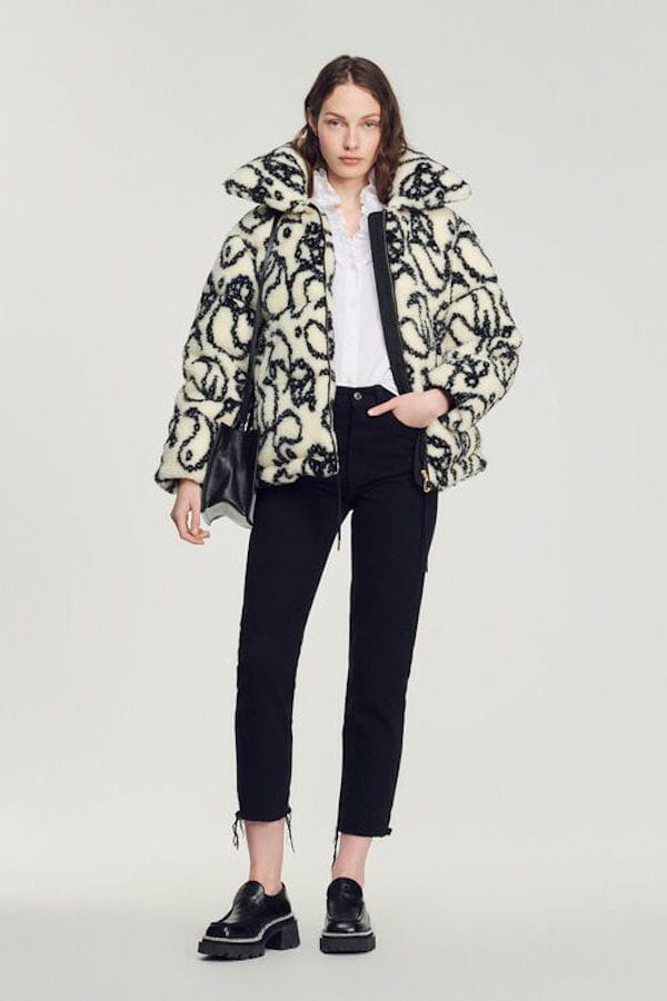 Manteau doudoune oversize en fausse fourrure imprimé motif jacquard de Sandro
