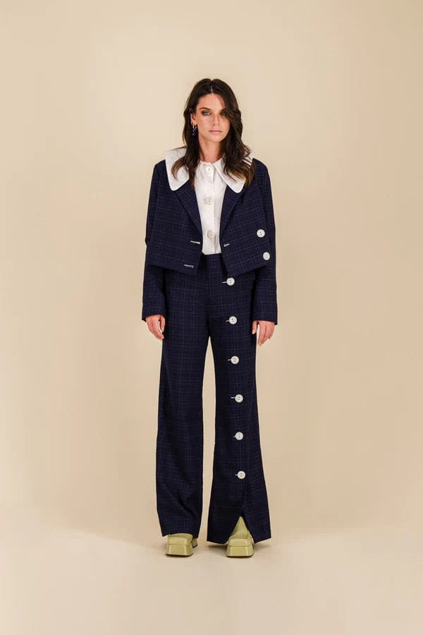 Pantalon taille haute flare à boutons et carreaux bleu foncé de Salut Beauté