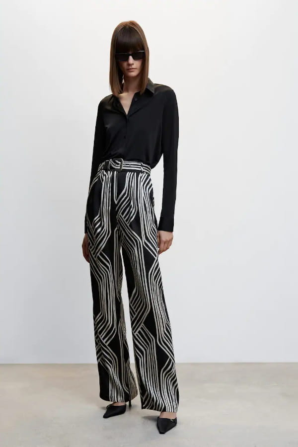 Pantalon noir palazzo imprimé et ceinturé de Mango