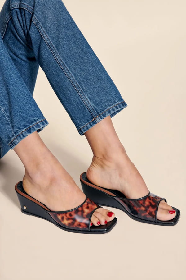 Mules compensées en cuir et vinyle effet écailles de tortue "Natty" de Rouje