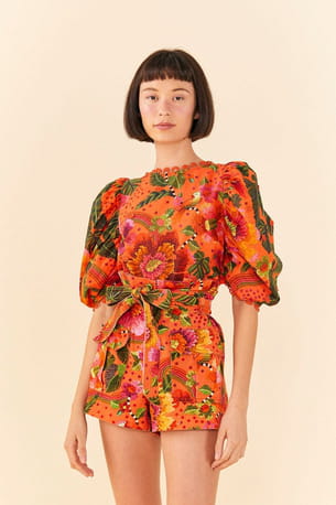 Chemisier à manches bouffantes à imprimé fleuri orange de Farm Rio
