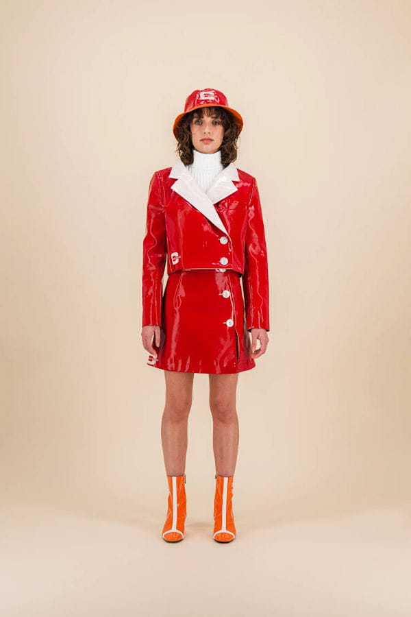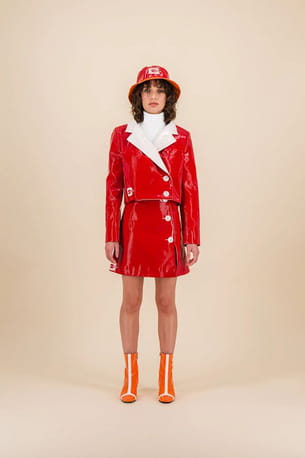 Veste courte rouge vernie "The Air Uniform" de Salut Beauté x Carel