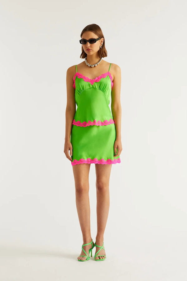 Minijupe en satin de soie verte à dentelle rose "Bradie" de From Future