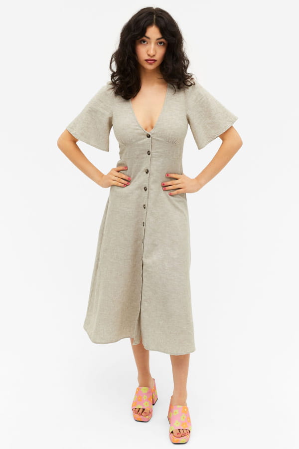 Robe midi en lin beige à manches courtes de Monki
