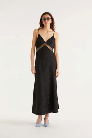Robe noire longue en jacquard et empiècements en dentelle "Carly" de From Future