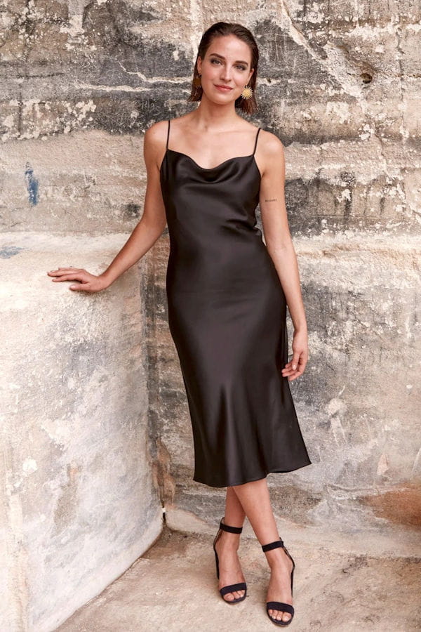 Robe noire satinée à encolure bénitier "Cosmique" de Septem