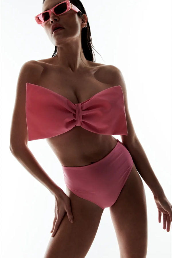 Maillot de bain deux pièces rose bustier nœud et culotte taille haute "Bow" et "Pebbles" de Love Stories