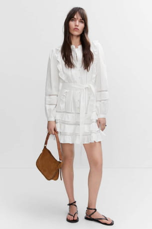 Robe blanche volantée en dentelle et nouée à la taille de Mango